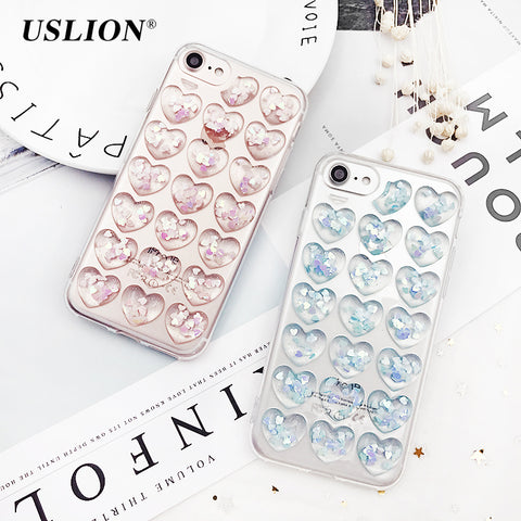 USLION Glitter 3D Love Heart Phone Case For iPhone 7 Plus Transparent Cases Soft TPU Clear Back Cover For iPhone X 6 6S 7 8 Plus