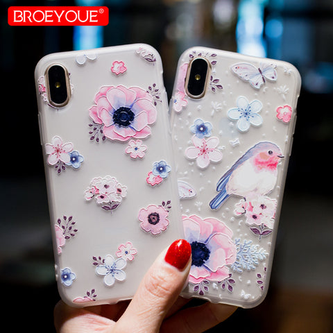 BROEYOUE Soft TPU Case For iPhone 5S SE 6 6S 7 8 Plus 3D Relief Flowers Print Ultra Thin Silicone Cell Phone Case For iPhone X
